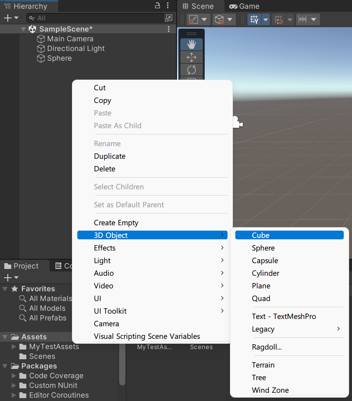 Hierachy 창에서 우클릭 > 3D Object > Cube OR Sphere 클릭으로
