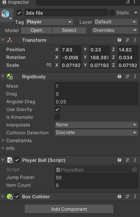 Collider 컴포넌트와 Rigidbody 컴포넌트, 그리고 내 스크립트를 적용시켰다.