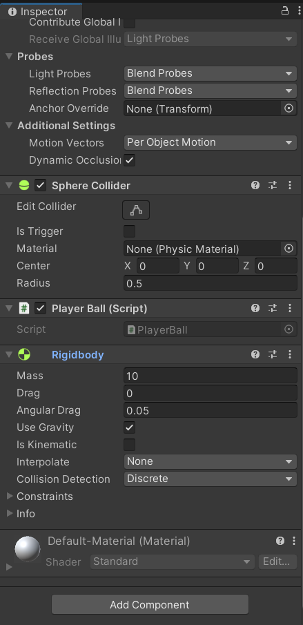 Rigidbody 옵션을 추가하고, 방금 만든 C# 스크립트를 Inspector 창으로 끌어와 적용시켰다.
