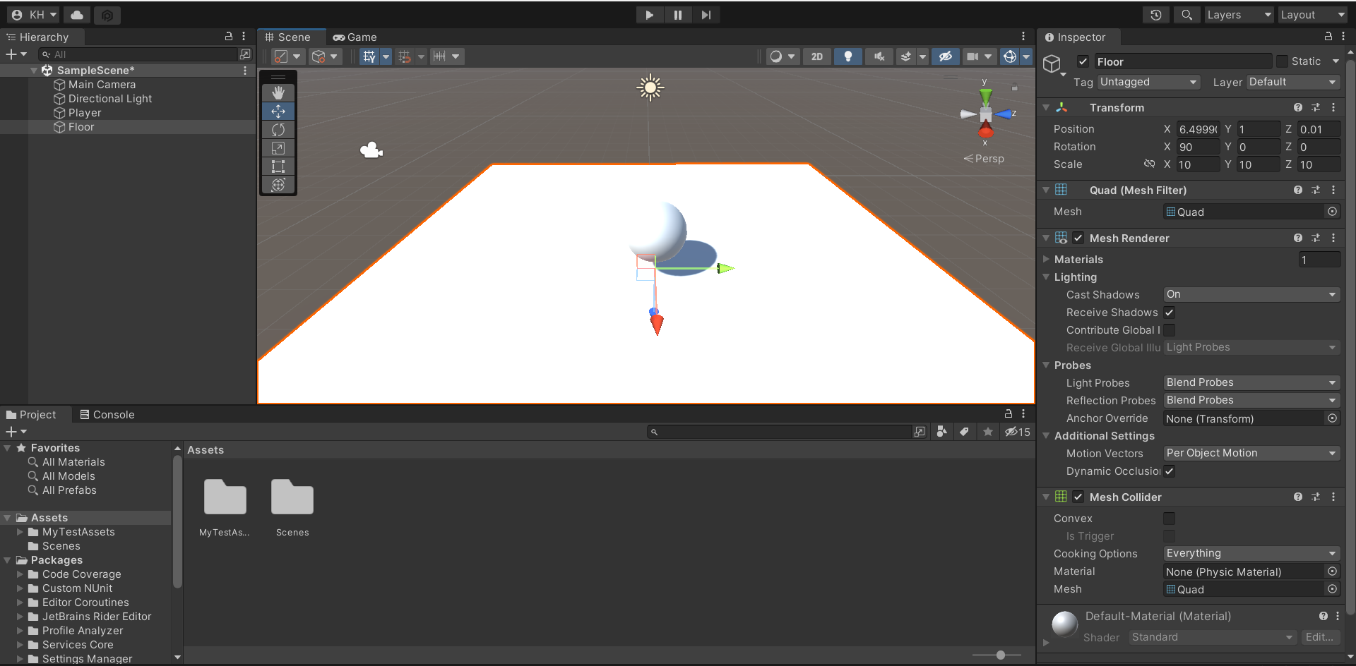 생성된 Sphere의 이름은 Player로, Cube 오브젝트의 이름은 Floor로 바꾸었다.