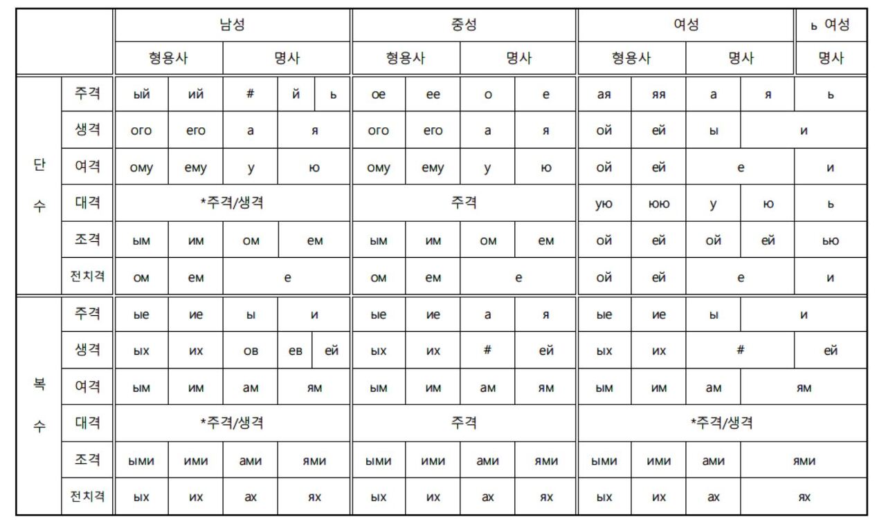 예를 들어 러시아어의 경우, 6개의 격(주격, 생격, 여격, 대격, 조격, 전치격)과 3개의 성(남성, 여성, 중성), 2개의 수(단수, 복수)에 따라 한 개의 명사나 형용사가 최대 6x3x2=32가지 유형을 보여. 이 중에는 형태의 중복이나 불규칙 변화와 같은 예외적인 상황도 있지만, 문법적 의미에 따른 유형의 가짓수만 따진다면 그렇다는 거지.
