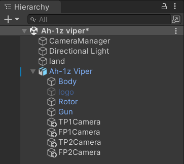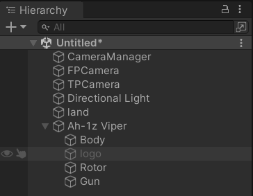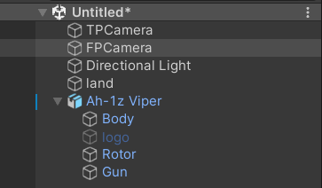 Hierachy 창에서 카메라들을 헬기 하위 오브젝트(?)로 넣어두고