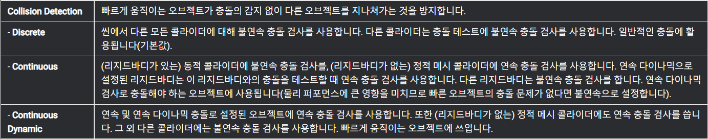 Continuous는 보간 검사를 실시하여 움직이는 대상과 정지한 대상 사이의 충돌 검사에