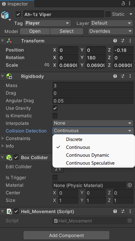 Collision Detection이 Discrete로 설정되어 있는 것이 문제였다.